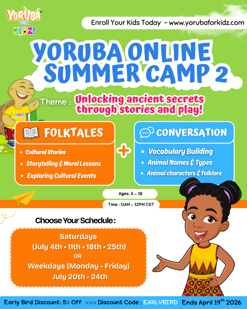 Explore rich Yoruba traditions, build confidence speaking and understanding Yoruba through fun, guided conversation, learn values and identity, and they can connect with kids like themselves from around the world!